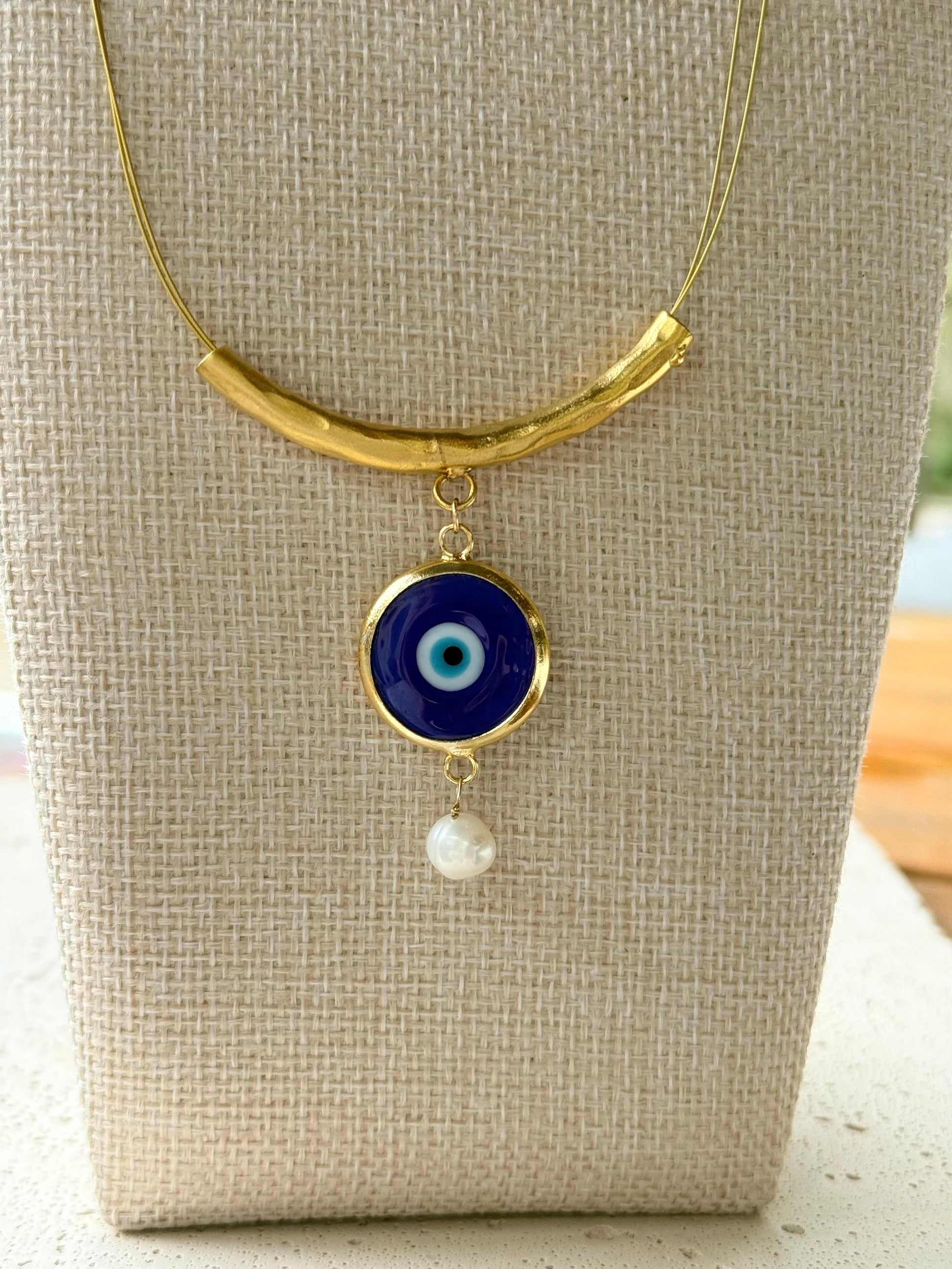 The necklace showcases a sculptural gold curved centerpiece with a dangling evil eye charm, finished with a delicate pearl drop for softness and balance. The adjustable ring mirrors the same striking evil eye design, creating a cohesive and powerful look when worn together.